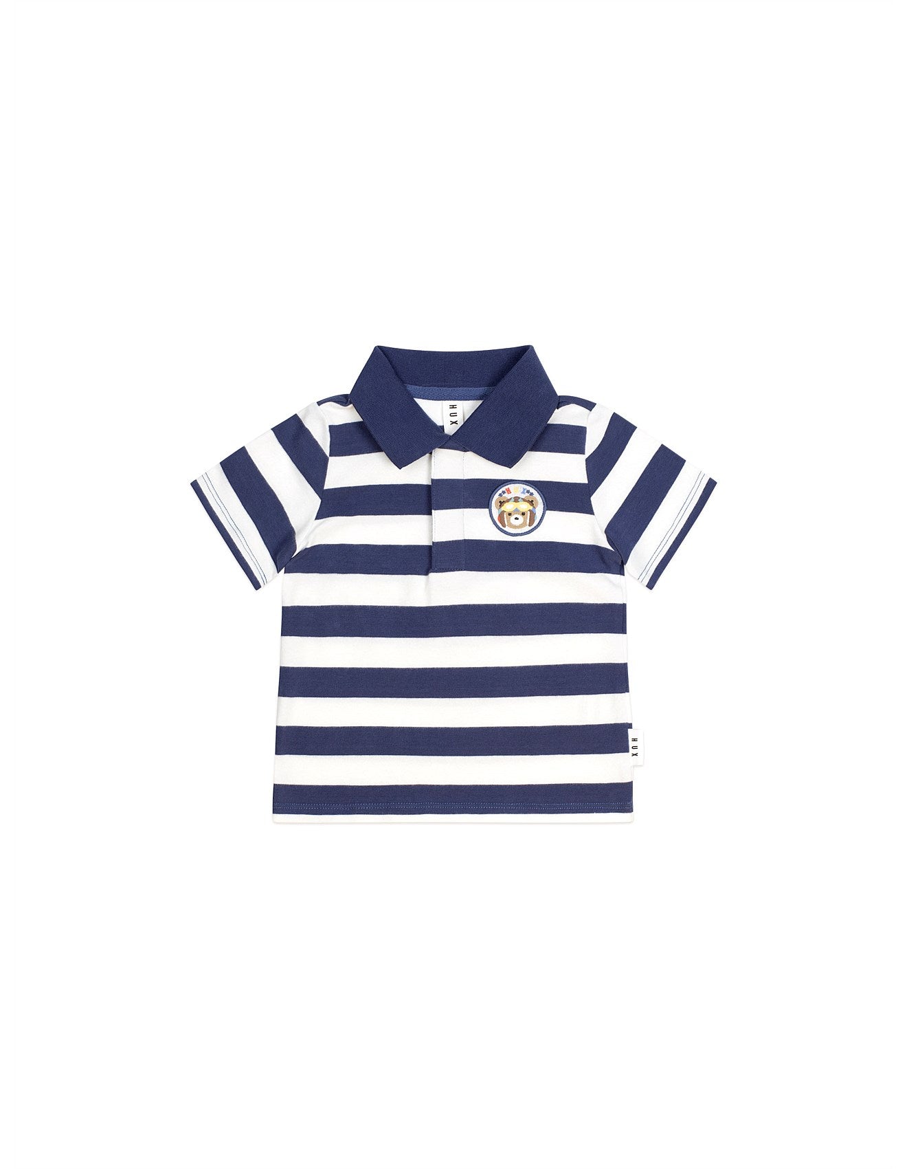 This short-sleeved polo in classic navy stripes features a sporty, rugby-style collar and three buttons at the neck. Made from cloud-like organic cotton, it has a pilot Huxbear badge detail and can be dressed up or down, depending on the day.