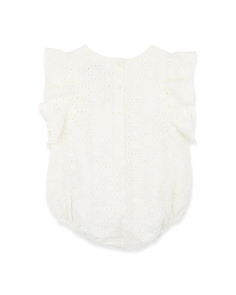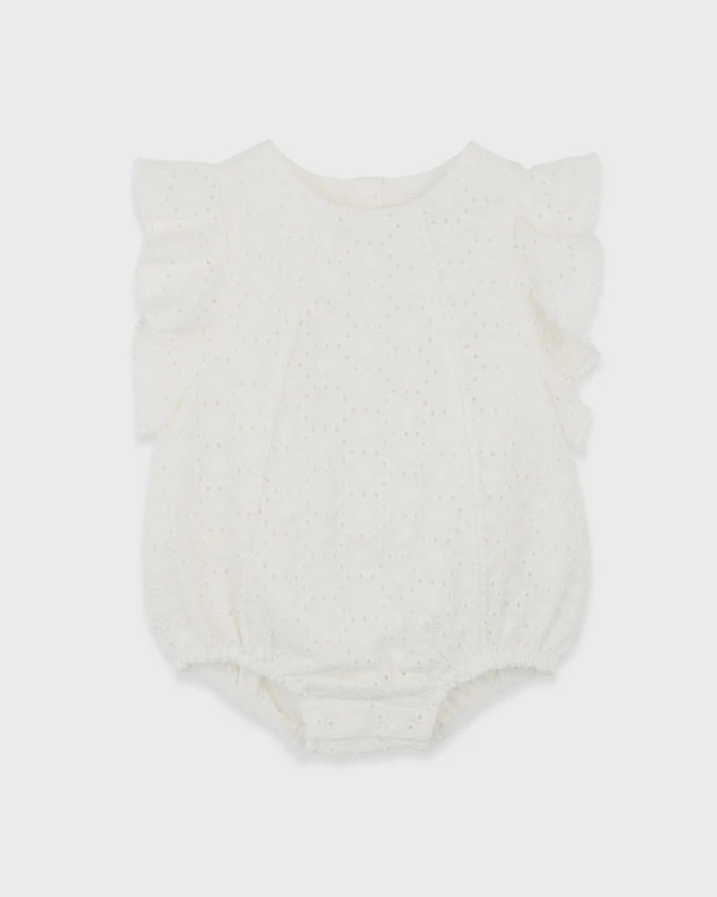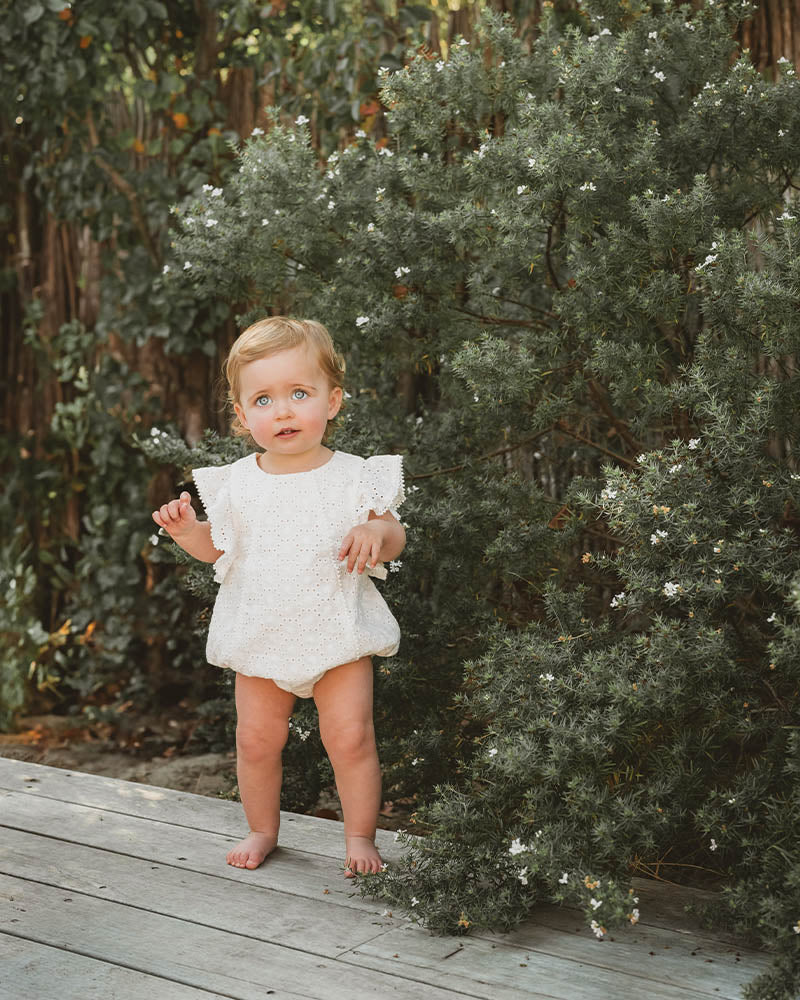 A timeless little outfit for sunny days and special memories, this beautifully crafted broidery romper is full of charm. Designed in soft cotton with delicate embroidery and pretty flutter sleeves with lace trim, it's a sweet blend of comfort and style. Perfect for playdates, family outings or first photos, it's the kind of piece that feels just as special as the moment.