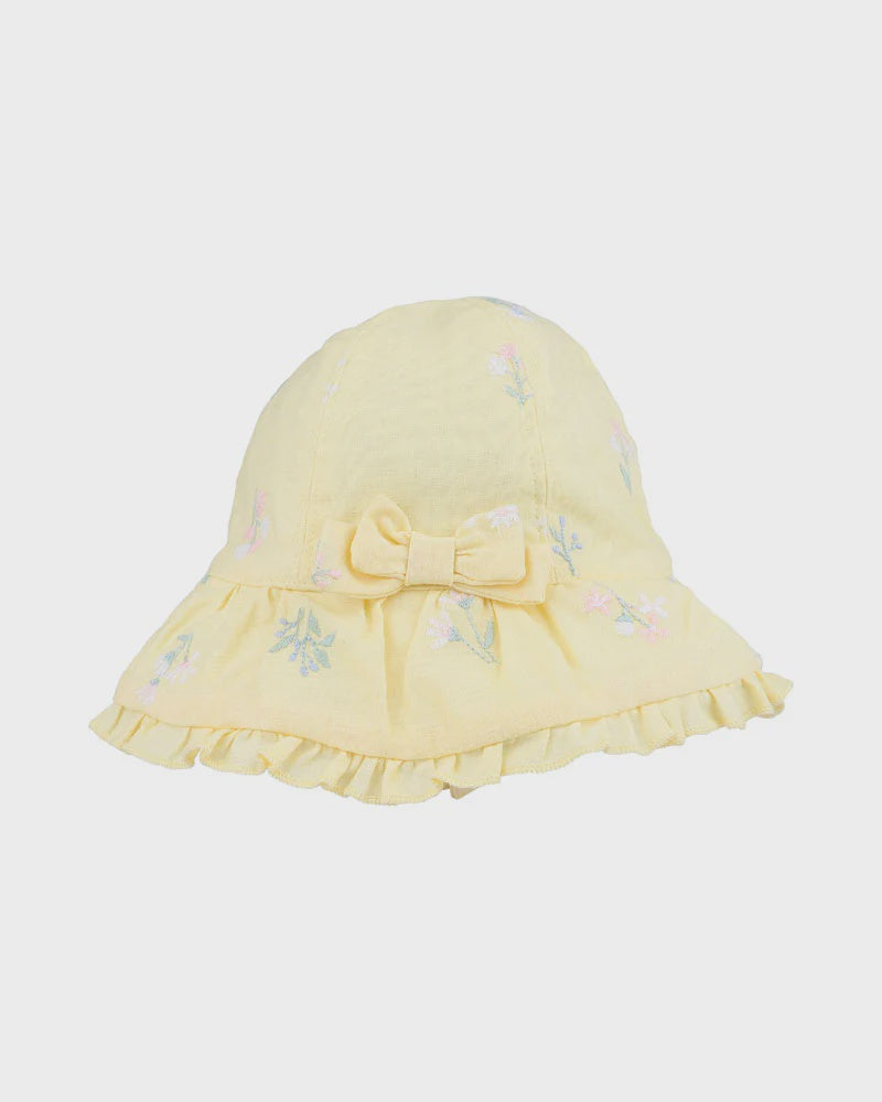 Top off her sunny-day outfit with this beautiful embroidered sunhat in soft lemon yellow. Featuring delicate all-over floral embroidery, a sweet bow detail at the crown, and a ruffle brim for added charm, it's both pretty and practical. Designed with a secure Velcro chin strap to keep it comfortably in place, and made from lightweight, breathable fabric to keep little heads cool and protected. Perfectly matches back with the Bonnie Embroidered Romper, Dress, Bloomers, or Bonnie Embroidered Shorts for a coordinated summer look.