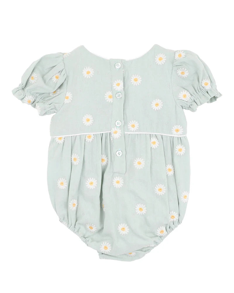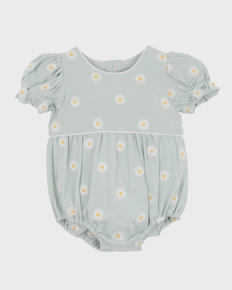 A fresh take on florals, this soft sage romper is sprinkled with playful embroidered daisies for a sweet vintage feel. The bubble silhouette and puff sleeves make it a timeless choice for warm-weather outings or milestone moments, all crafted in breathable 100% cotton for all-day comfort.