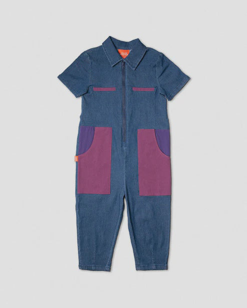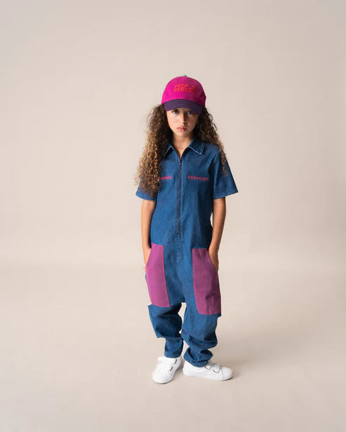 This fun, colourful denim boiler suit combines comfort and style in one easy outfit. Featuring a bold zipper front and vibrant purple pocket details, it’s perfect for active little ones who love to explore.