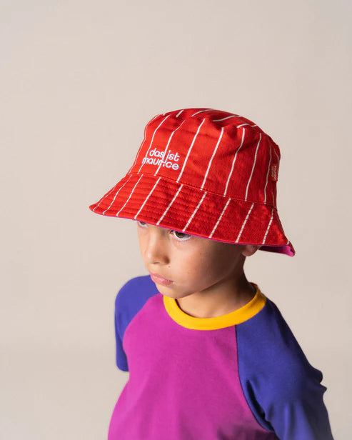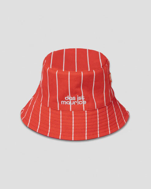 Top off any outfit with the ultimate statement piece, the reversible pinstripe Bucket Hat in bold orange/red and crisp white. Designed with classic vertical pinstripes and embroidered with the iconic Das Ist Maurice logo, this hat adds instant cool to sunny day adventures.
