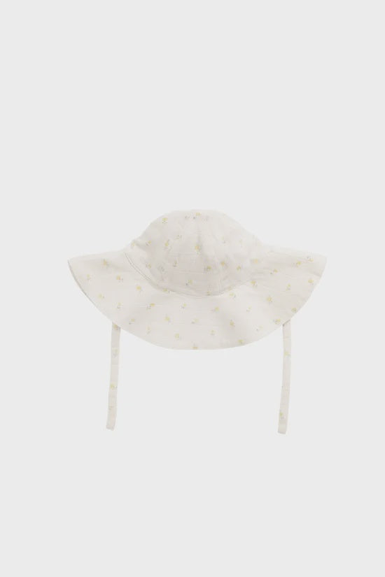 A sweet and sun-safe essential for your little one. The Noelle Hat in Vintage Ditsy features a soft white base adorned with delicate yellow floral prints, a wide brim for gentle sun protection, and tie straps to keep it securely in place. Perfect for sunny strolls and outdoor play, this hat adds a charming floral touch to any outfit.