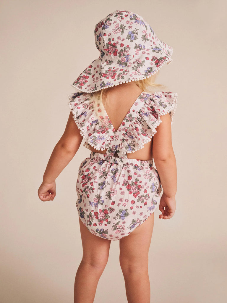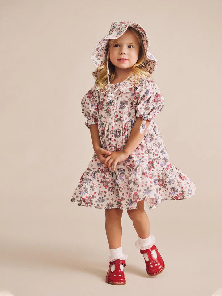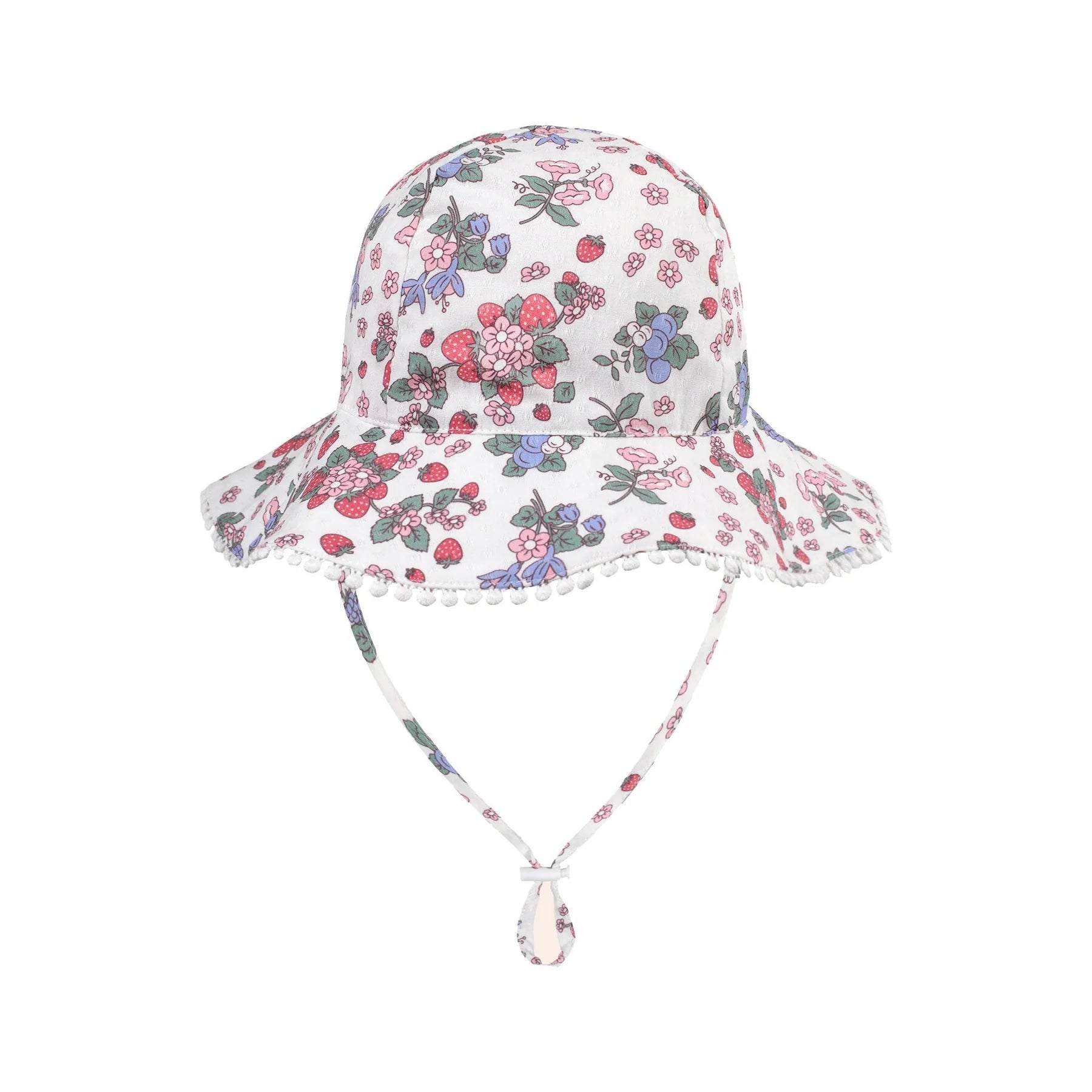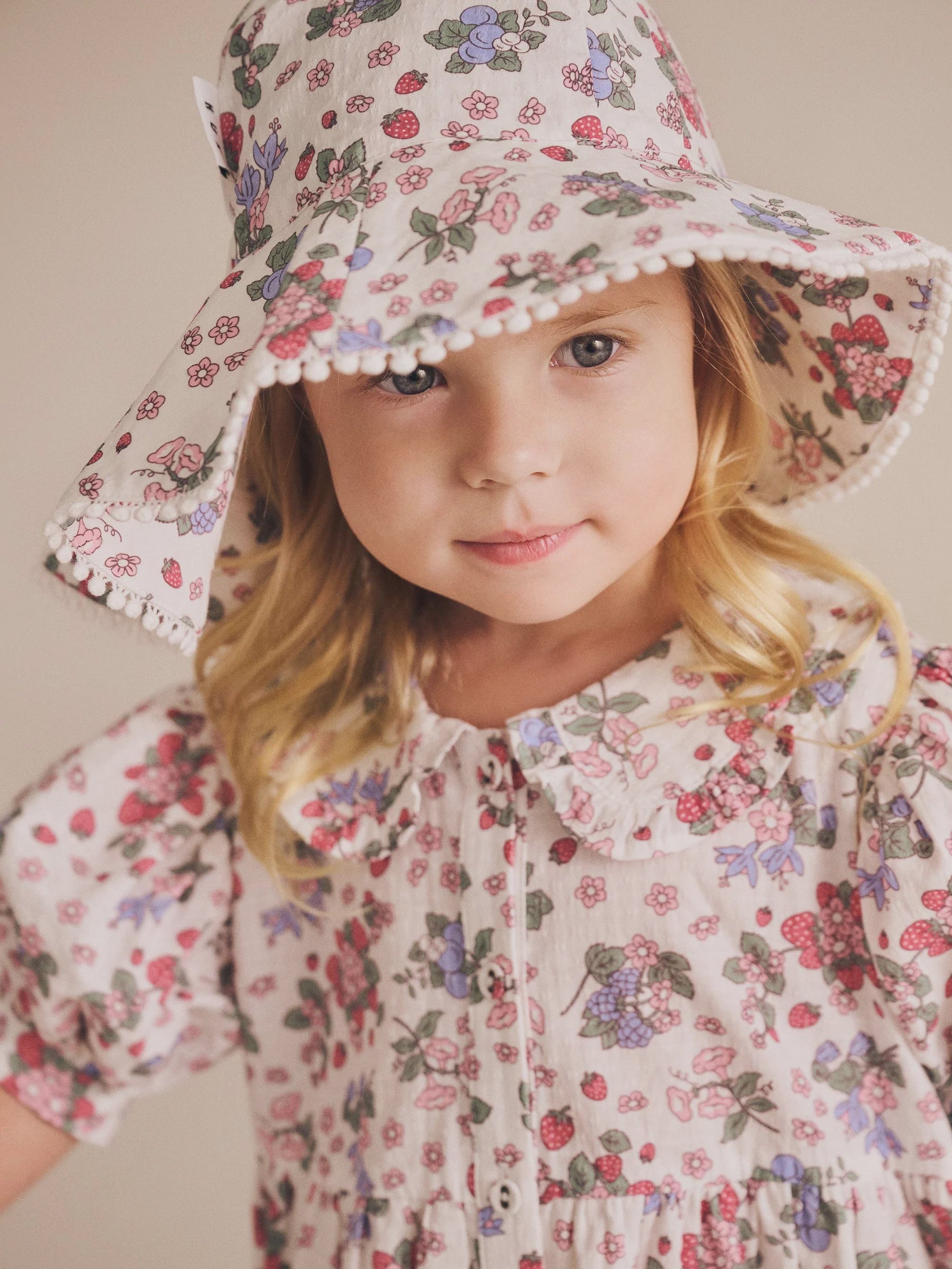 A hat they’ll actually want to wear. This wide brim sun hat is practical and pretty. Made from breathable organic cotton, it features a sweet strawberry garden print and wider brim for extra sun protection. Adjustable chin strap to prevent from flying away.