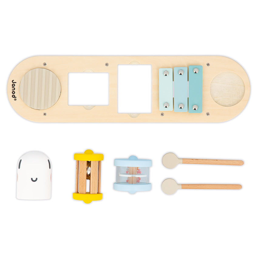 Discover the delightful caterpillar-shaped sound activity table with 5 integrated sound activities, allowing children to explore and create their own symphony. Includes a maraca to add rhythm, a xylophone to play melodies, a bell for a soft sound, a rain stick to imitate the soothing noise of rain and a guiro for a unique sound. Practical and cleverly designed, the sticks are stored in the caterpillar's head. What?s more, the 2 rattles and the head are removable for even more play options: baby can grab whichever musical toy they choose, shake them to the beat of the music and then learn to return it to the right place. This educational toy is ideal for helping younger children discover and experiment with different sounds, developing their aural perception. Made with FSC certified wood and complements many items in the Janod Cocoon range.