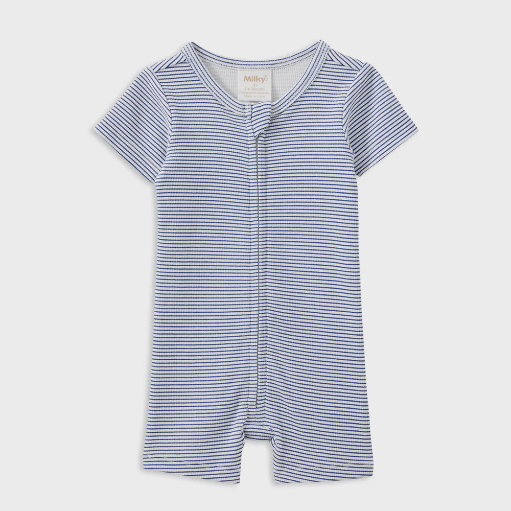 Milky Clothing Blue Rib Zip Romper. Introducing our adorable Blue Rib Zip Romper, the perfect blend of comfort, style, and functionality for your little one. Crafted with utmost care and attention to detail, this romper is designed to keep your baby snug and stylish all day long. Featuring a horizontal stripe in blue and white, this romper adds a touch of charm to your baby's wardrobe. The playful design is complemented by a convenient center front 2-way zip, making dressing and nappy changes a breeze.