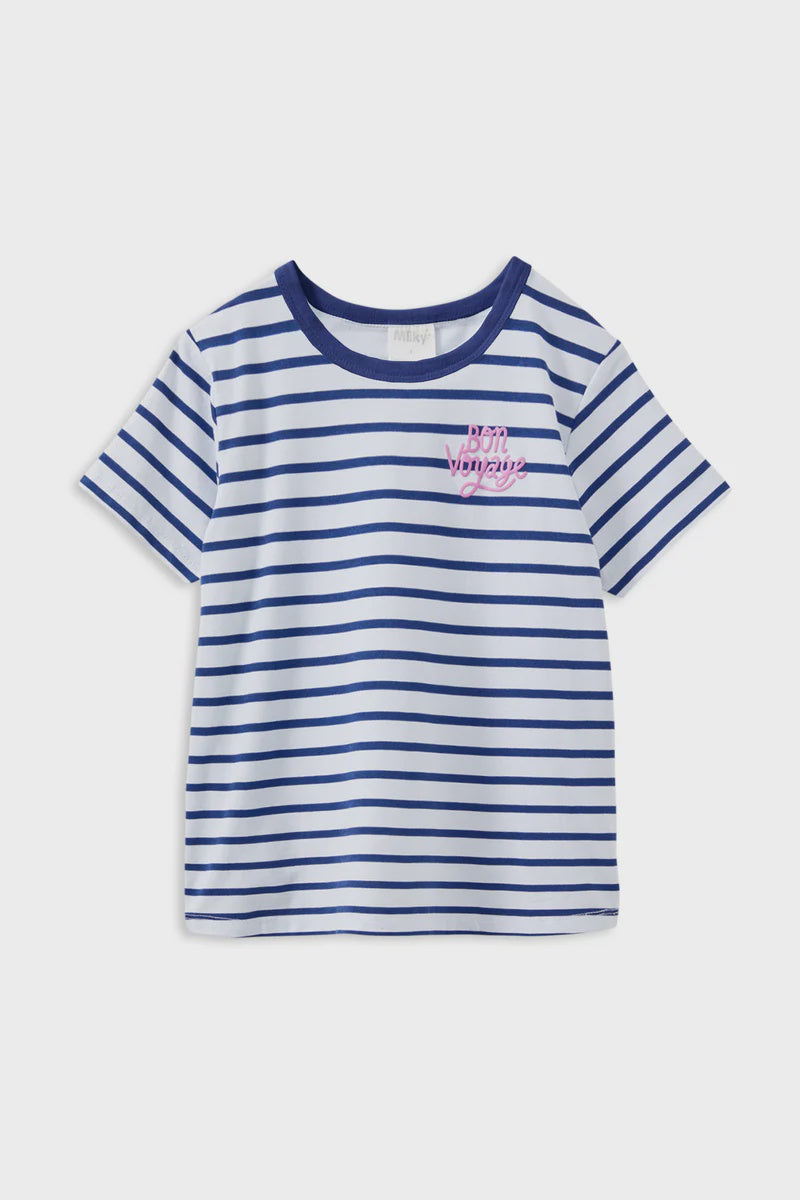 Milky Clothing Bon Voyage Tee is a versatile essential for your little ones summer wardrobe. Crafted on a white base with a navy horizontal stripe with a pink 'Bon Voyage' print (on the wearers left chest) this timeless piece offers effortless style for any occasion. Featuring a classic round neckline and short sleeves ensuring a seamless fit. Pair it with your favorite Milky shorts or skirt for a casual look, and layer with pants or a cardigan when the weather cools down. Also available in pink and red, this tee is designed to withstand wash after wash, promising lasting comfort and style.