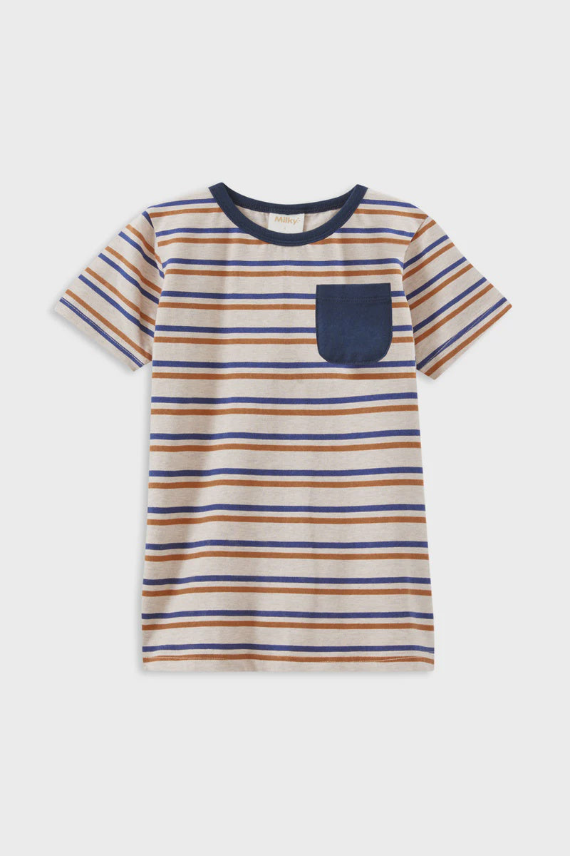 Milky Clothing Mini Stripe Pocket Tee. Add some style to your little ones summer wardrobe with this cool short sleeve t-shirt! Featuring a comfortable fit, it keeps your little one looking sharp and feeling great all day. With horizontal stripes in tan, navy, and oatmeal, plus a navy rib neckline and pocket, its both stylish and versatile.