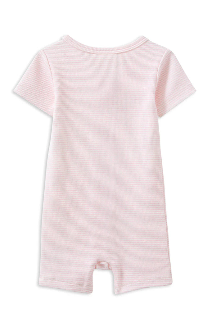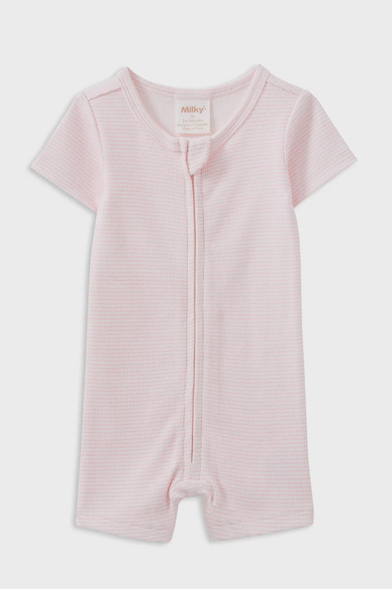 Milky Clothing Pink Stripe Rib Zip Romper. Soft, stretchy, and oh-so-easy — this ribbed romper is made for warm days and wiggly babies. The sweet pink stripe keeps things playful, while the two-way front zip means quick changes with zero fuss. With short sleeves and legs for breezy comfort, it’s a must-have for summer naps, pram strolls, and everything in between.