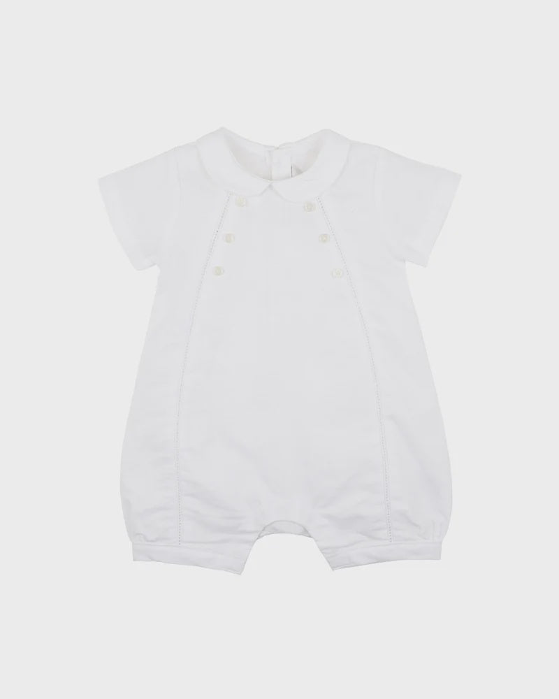 This beautifully tailored romper is a timeless addition to your little one's wardrobe, perfect for christenings, celebrations or any special moment. Crafted from a soft, breathable linen-cotton blend, it features a classic Peter Pan collar and sweet cuffed leg openings for a polished silhouette. Delicate faggoting detail runs down the front, framed by rows of decorative buttons that nod to traditional charm. A back neck button closure and press studs at the crotch ensure fuss-free changes, making it as practical as it is elegant.