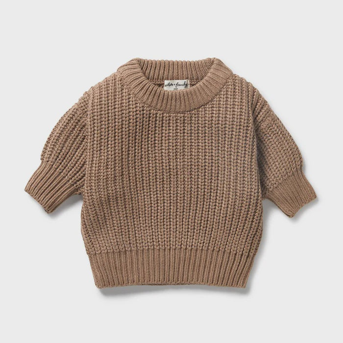 Introducing the chunky rib knitted jumper, perfect for your little ones! Made from a cosy blend of organic cotton, wool, and bamboo, this jumper features a roomy fit, ribbed cuffs and neckline. Keep your child warm and stylish with this must-have winter essential!