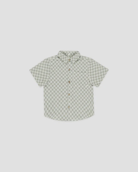 A classic collared boys short sleeve button-down shirt with coconut buttons.