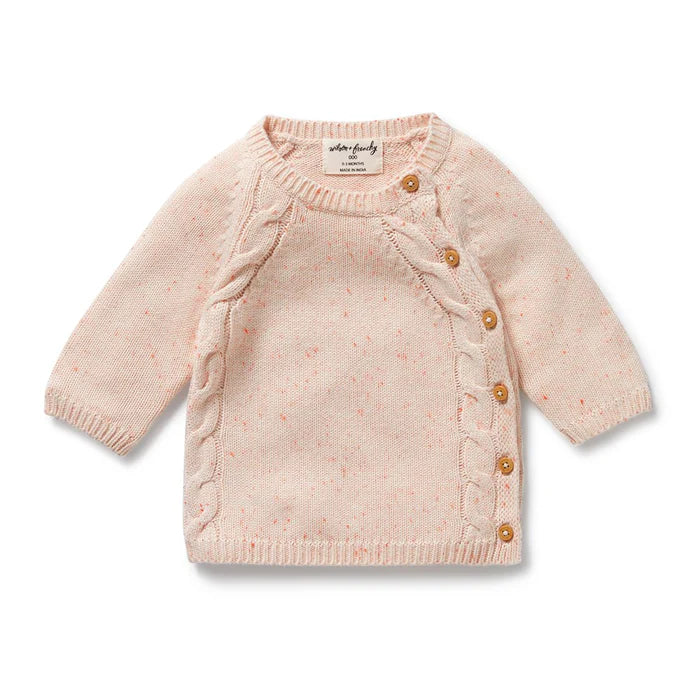 Introducing our knitted kimono cardigan for babies! With a cosy cross over design, long sleeves, and mock wood buttons, this cardigan is both stylish and functional. Made from organic cotton, bamboo, and wool, it's easy to put on and take off, providing extra warmth for your little one. Comfort and cuteness combined!