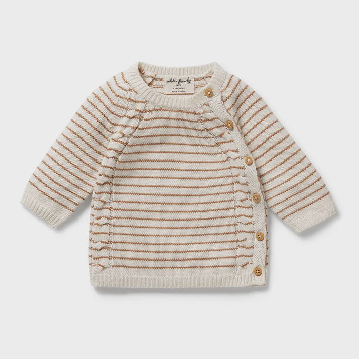 Introducing our knitted kimono cardigan for babies! With a cosy cross over design, long sleeves, and mock wood buttons, this cardigan is both stylish and functional. Made from organic cotton, bamboo, and wool, it's easy to put on and take off, providing extra warmth for your little one. Comfort and cuteness combined!