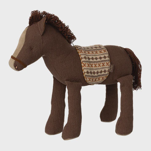 The brown pony is made in a soft cotton/linen fabric. The mane and tail are cotton strings, and the saddle is made in knitted fabric that guarantees the ride will be comfortable for your Maileg friends. Measures H21cm x W21cm.