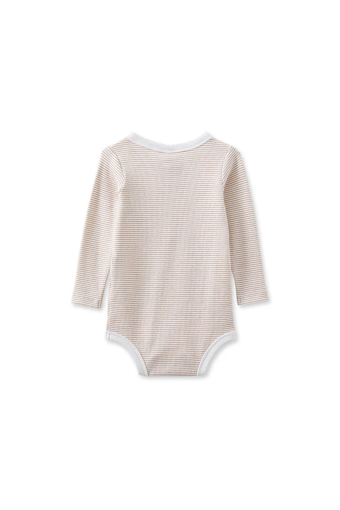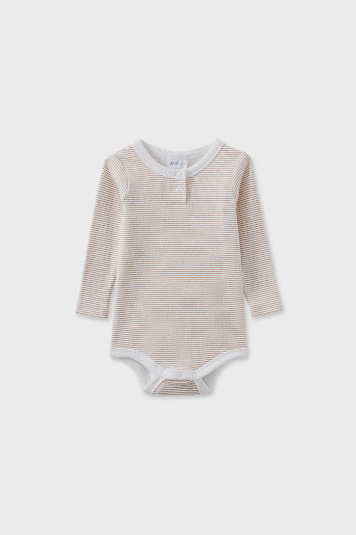 Milky Clothing Mocha Stripe Bubbysuit—a versatile staple for any season! This charming bubbysuit features an adorable button detail at the center front, adding a touch of style to your little one’s wardrobe.