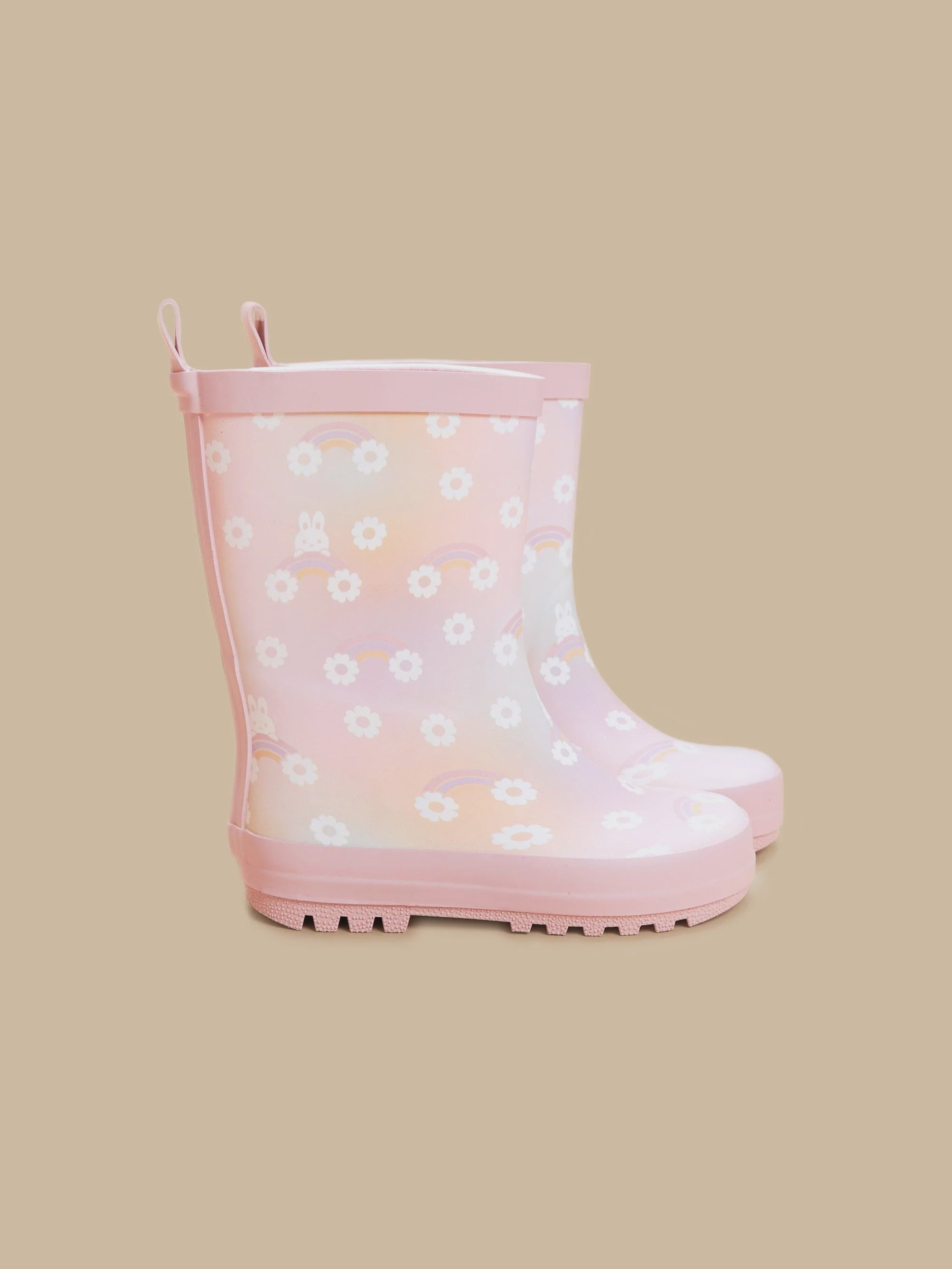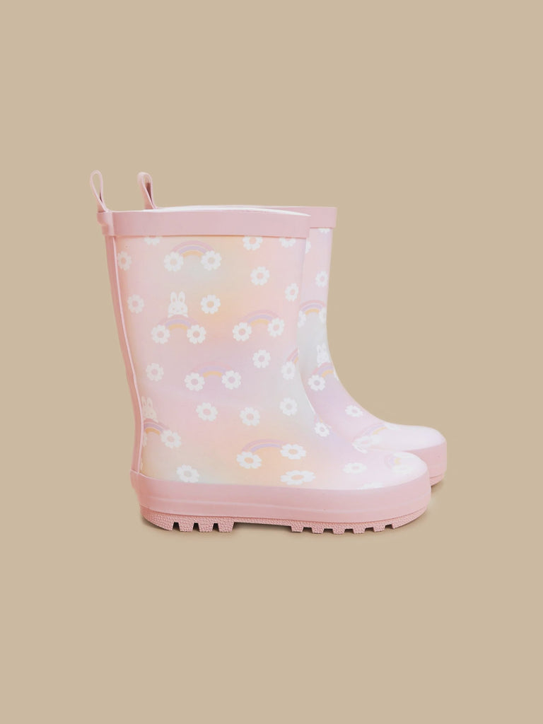 Perfect for jumping in puddles and parading in the mud! Our Rainbow Bunny Rainboot is perfect for wet weather play! Made from 100% rubber featuring an all over rainbow bunny print.