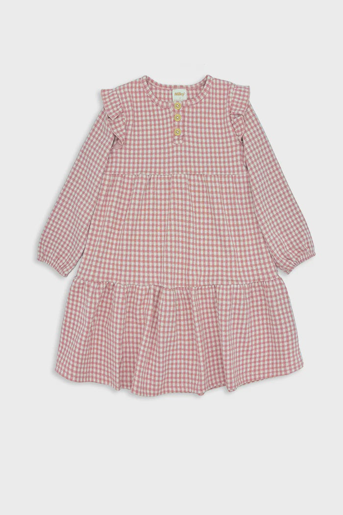 Milky Clothing Rose Check Frill Dress. This check dress will soon become your little one's favourite. Made from a thick stretch fabric perfect for cold weather. This dress has a centre front button opening, tiered layered skirt and frill at shoulders It can be paired with tights and a jacket or worn alone. This style can be dressed up for a fancy occasion or perfect for a play date with friends.