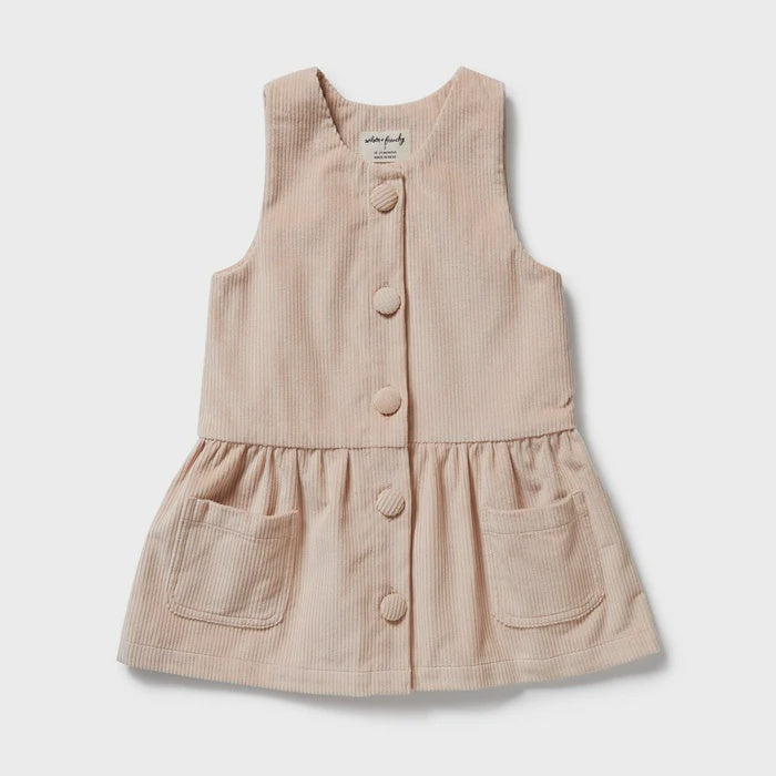 Dress your toddler in this cord dress for a roomy and comfortable fit. The fabric covered button adds a touch of charm. Pair it back with our knitted tights for a cosy and cute outfit.